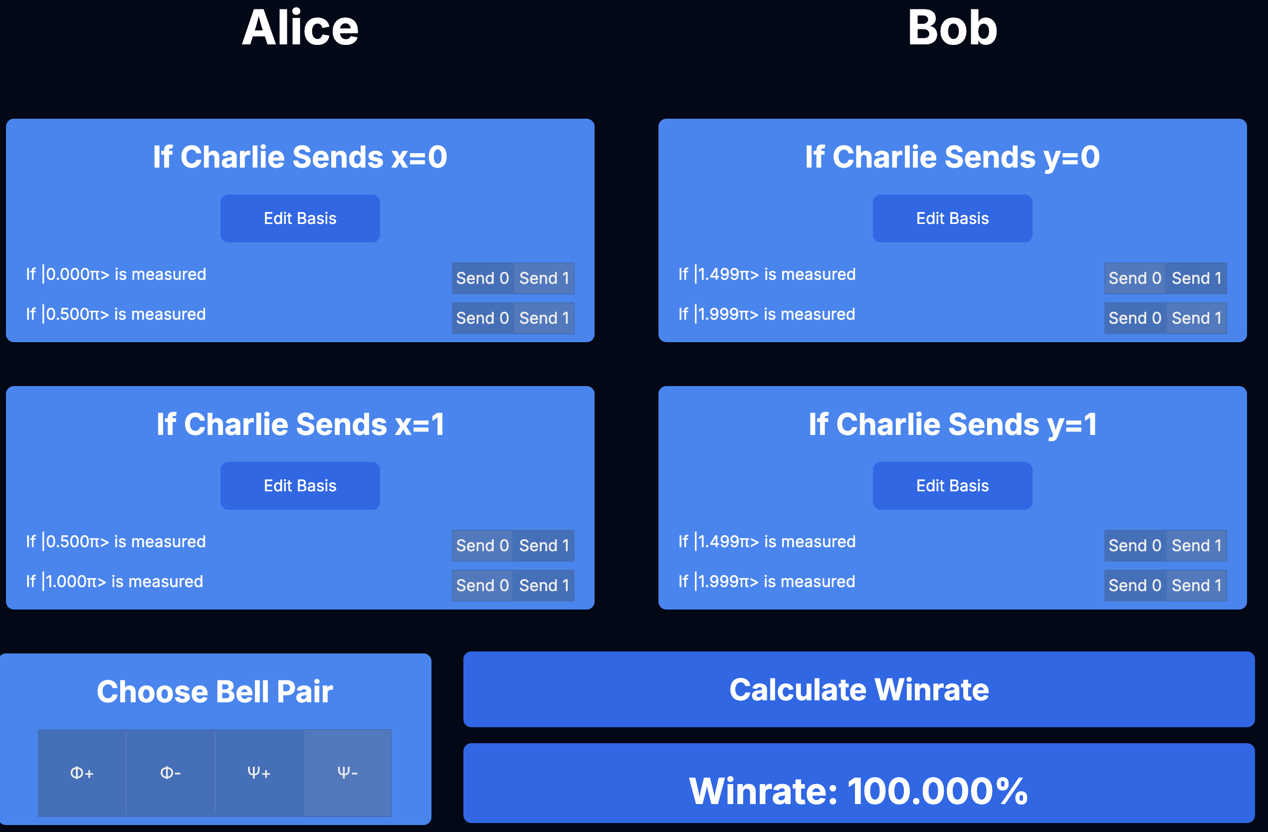 - What should the probability that Alice and Bob win using this strategy be if \(x=0\) and \(y=1\)?