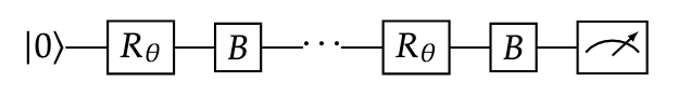 - How many applications of the pair of \(R_\theta\) gate and \(B\) gate do we need to apply until we can maximally be certain about which case we are in? Call this number \(T\).