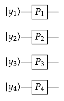2. Now suppose that \(y \in \{0, \ldots, N - 1\}\). Let \(y_1\ldots y_n\) be the binary representation of the integer \(y\). Express the output of the circuit below as a function of \(y\) and the \(N\)-th root of unity \(\omega\). Here, we are using the gate
